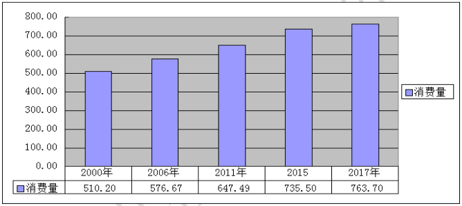 图表1-1 2000年---2017年中国牛肉消费量(单位:万吨)