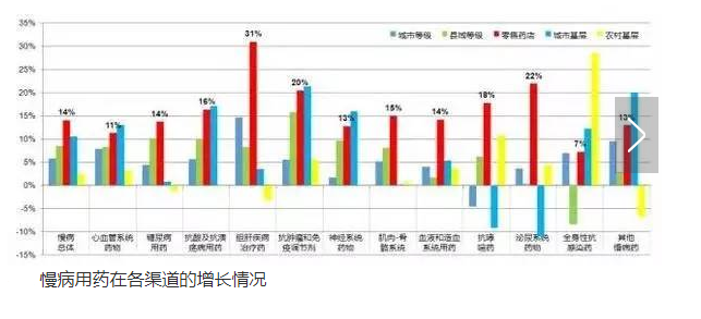 随着分级诊疗模式的推进,慢病看护下放到基层成为趋势。数据显示,慢病各品类2015年在零售药店的增长率明显高于其他渠道。(如下图所示)