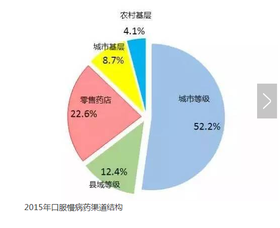 根据2015年的统计数据,虽然零售药店只占全部慢病药销售总额的12.3%,但单从口服慢病药来看,零售药店的份额达到22.6%,是口服慢病药销售的第二大终端渠道。