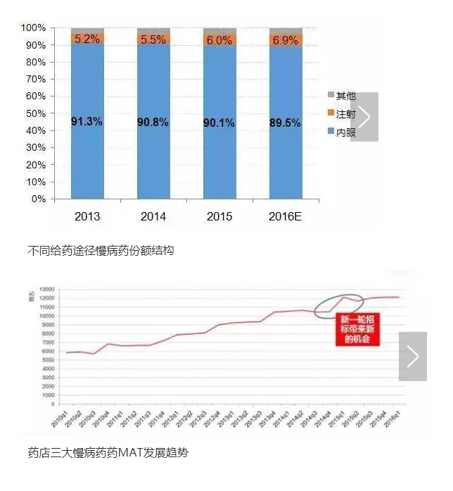 2、药店的主体地位凸显。相关调查显示,慢病患者在患病初期和确诊过程依赖医院,但在病情稳定后,药店成为其购药的主要渠道。