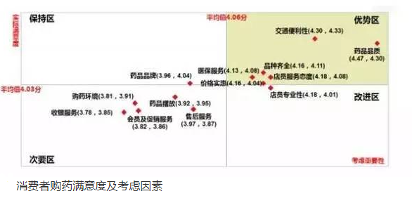 那么,消费者在药店购药过程会考虑哪些因素?他们的满意程度如何?从下图可看出,药品品质和位置交通便利性是消费者选择药店的首要考虑因素,其满意度也较高。值得关注的是,店员专业性一直处于改进区,针对这一方面的改进与提升可以说是药店未来的机会点。