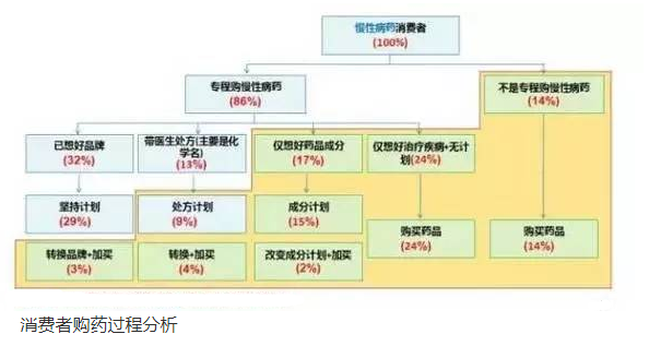 实际上,药店店员为顾客推荐的机会点很大,辐射面很广,店员推荐的影响力能辐射到71%的慢性病购药者。(见下图黄色区域)但是,由于专业型的限制,店员推荐对消费者决策的实际影响力还很小。此外,慢病患者服药依从性较低。多数患者做不到规律服药或遵照医嘱服药,原因多为忘记服药、药物疗效不好和药物出现副作用。