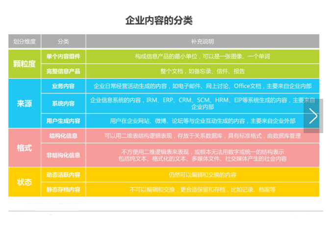 “内容”一词源于出版媒体业,开始主要指的是书报杂志、唱片影带里的创作内容。随着计算机、互联网的普遍使用,企业内外信息的流通不断加速,文档与资料数量不断增加,内容的范围不断扩大,由原来的出版媒体内容,发展为企业内外所有与其相关、以数字形式展现的信息聚合。企业内容可从内容分割度、内容来源、内容格式、内容状态等不同维度进行分类。