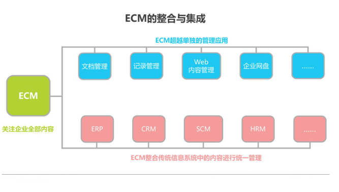传统信息管理系统往往只关注某些特定形式的数字化信息,彼此之间相互独立,如文档管理、记录管理、Web内容管理、企业网盘等,也可能只关注特定业务内容,如ERP、CRM、SCM、HRM等。但ECM是企业级的信息管理系统,它关注企业的全部内容,超越了单独的管理应用,打破了业务与部门限定导致的信息孤岛。ECM的现代化的整合与集成的解决方案,也促进了知识管理与业务流程管理的融合。