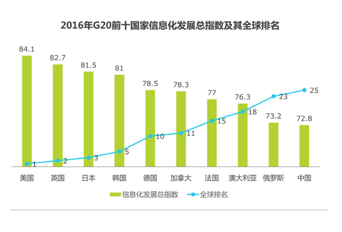 中国互联网络信息中心对全球各国家评价结果显示,中国信息化全球排名大幅度提升,中国信息化发展在产业规模、信息化应用效益等方面取得长足进步。根据国家信息化发展指数,中国的排名从2012年的第36位迅速攀升至2016年的第25位。从全球范围来看,以美国、英国、日本、中国、俄罗斯为代表的大型经济体,具有强大的信息产业基础和庞大的用户市场规模,信息化发展优势明显。“二十国集团”(G20)国家的信息化发展在全球居于超前位置,俄罗斯(第23名)与中国(第25名)首次超过二十国集团的平均水平。