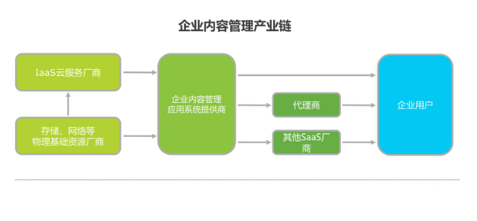 企业内容管理行业的核心为ECM应用系统的提供商;基础为满足企业存储、网络需求的云服务厂商或物理基础资源厂商;通过代理商或直销进行销售;服务对象以知识密集型、传输密集型领域的企业用户为主,也可嵌入其他厂商的SaaS系统间接提供服务。