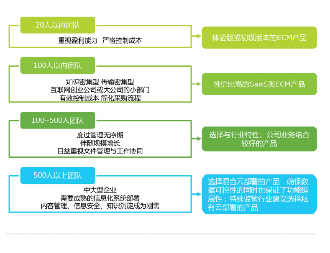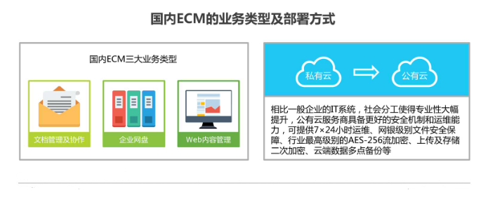 目前国内企业ECM的主要业务类型集中在文档管理及协作、企业网盘、Web内容管理等,部署方式以私有云为主。企业选择私有云部署主要是出于安全层面的考虑,特别是大型企业普遍保守,而私有云私密性强,也可充分利用企业闲置硬件。伴随公有云服务的发展和企业对公有云认知的加深,企业因转型需要开始逐步接受公有云产品,传统IT向公有云转变的总体趋势愈发明显。