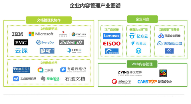 企业内容管理产业图谱:文档管理及协作、企业网盘、Web内容管理三大类