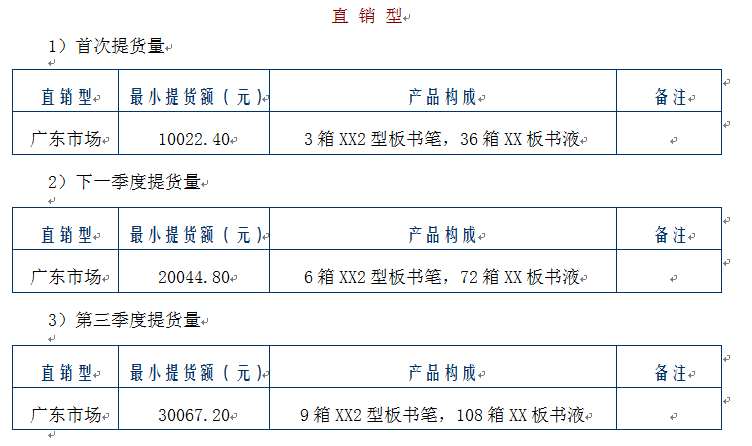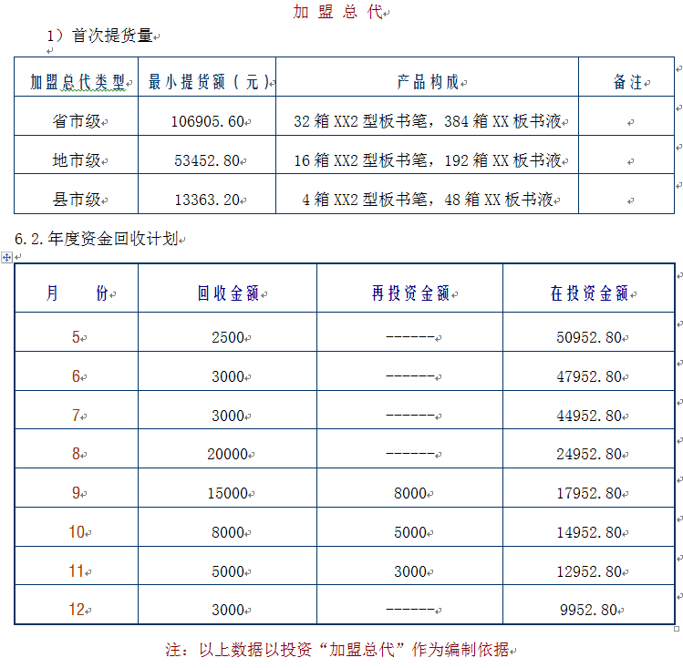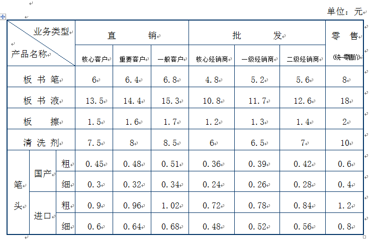说明:① 直销型业务是指代理商面对学校、培训中心、企事业单位、机关团体等潜在客户进行直接销售的一种商业模式 ② 批发型业务是指代理商通过开拓区域内各级分销商并借助其零售终端进行产品销售的一种营销方式 ③ 零售业务是指通过自营店面把产品或服务直接提供给消费者的一种经营方式 ④ 在正常情况下,板书笔本身最少可以使用2年(笔头坏了可以更换),其成本可以忽略不计;配套板书液的市场零售价为18元/瓶,可加注10次,相当于“XX”环保水性板书笔的实际零售价格为1.8元/支,参照以上 * 所注内容,可以得出:其价格仅为同类商品的1/2。