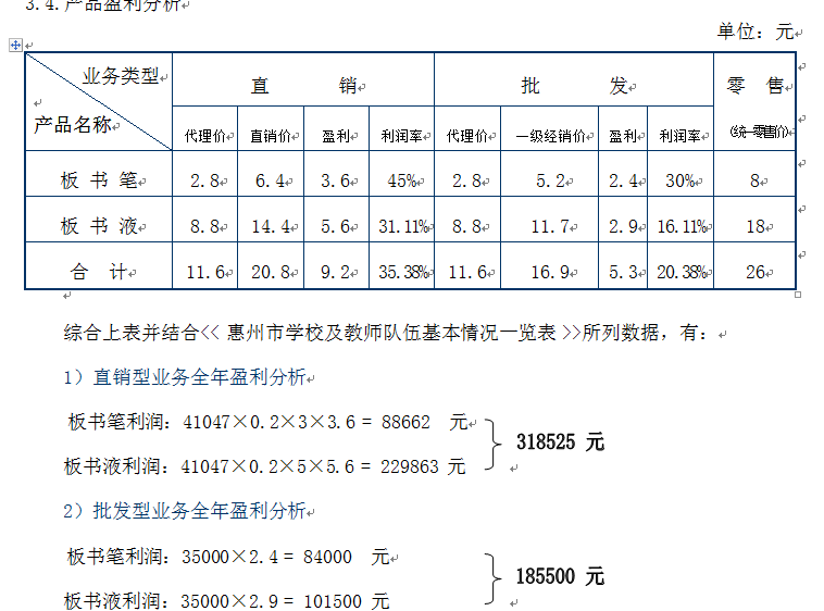 综上所述,“XX”环保水性板书笔(液)在惠州地区全年的盈利估计为: