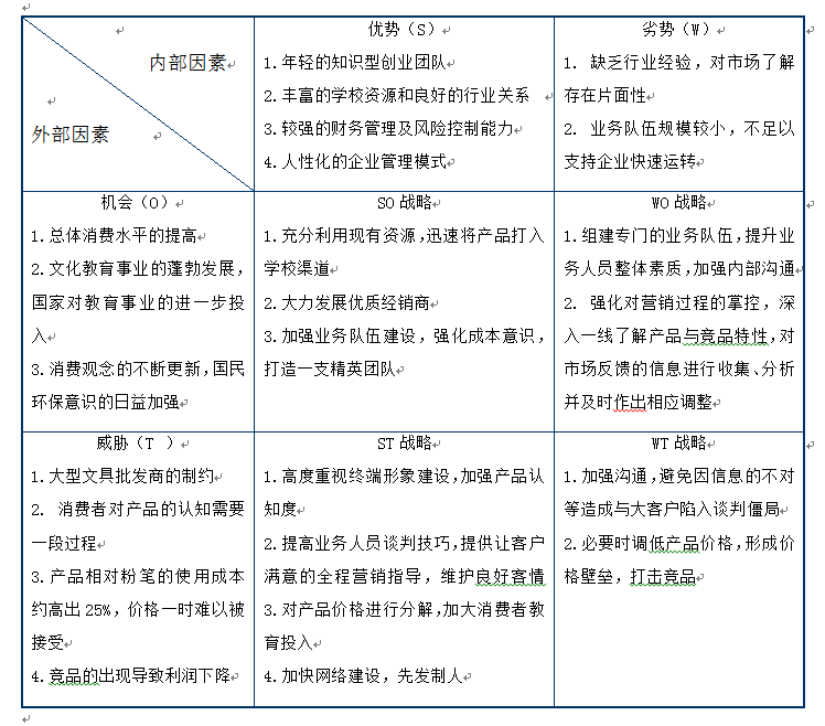 上述分析表明,在项目运营上我们应该充分利用公司现有的资源与能力优势,抓住“XX”环保水性板书笔切合当前消费需求并且为国内首创这一机遇,选择增长型战略(SO)
