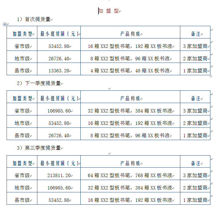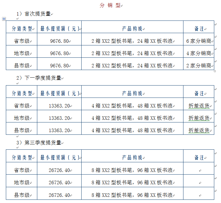 注:① 分销商首次提货时按分销商价格结算 ② 当分销商按照厂家提货规定完成下一季度提货量时则按加盟结算价与分销商结算,并将首次提货的差价按货物形式折返给分销商