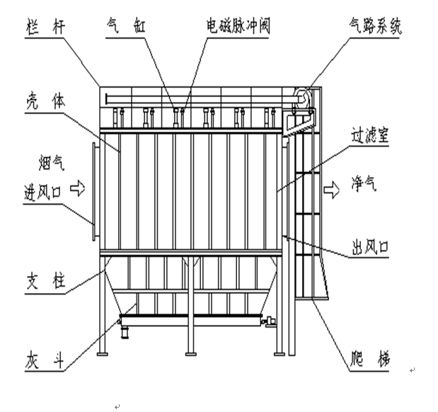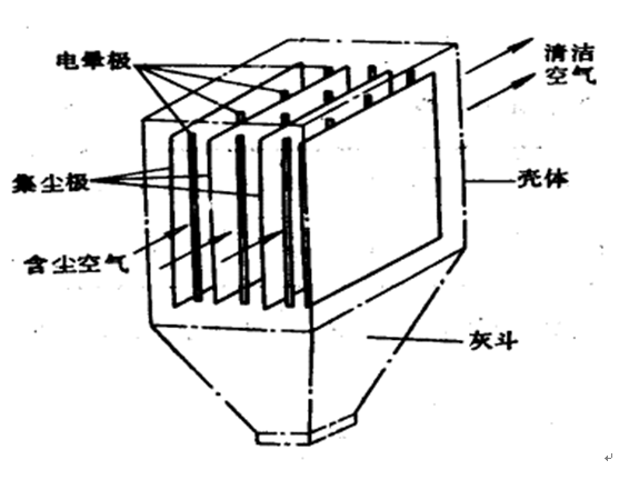 电除尘器主体电由壳状,灰斗,集尘极(阳极板)电晕极(阴极线)组成。当含尘空气通过时集尘极与电晕极放电使粉尘颗粒荷电后吸附在集尘板上,实现其除尘目的,清洁空气排出,通过振打将集尘板上的粉尘收集到灰斗中。