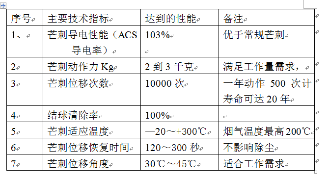 “自动去除结球芒刺线技术”是将传统固定式芒刺改变为可按设计的位移范围进行位移运动的自动去除结球芒刺线,它在运动中能够清除结球。当两支芒刺向同一个交点进行剪切位移时,产生磨擦、挤压、碰撞,使初步形成的结球从芒刺尖端破碎脱落,阻止结球生成,从而使电除尘器保持99%的除尘效率。