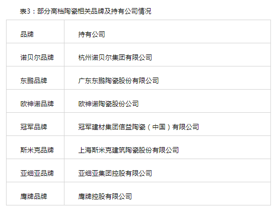 目前我国高档建陶产品的生产厂家主要有杭州诺贝尔集团有限公司、广东东鹏陶瓷股份有限公司、欧神诺陶瓷股份公司等八家企业。这些企业代表了中国建陶企业的最高水平。由诺贝尔、东鹏、欧神诺、冠军、鹰牌、斯米克、亚细亚等品牌占据国内建筑陶瓷高档市场的大部分份额,成为建陶高档品牌的代表。