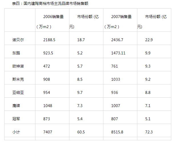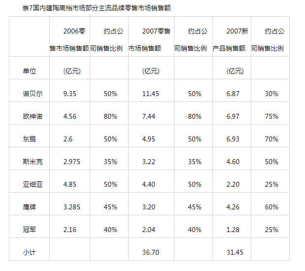 目前国内建筑陶瓷高档市场主要由诺贝尔、东鹏、欧神诺、冠军、鹰牌、斯米克、亚细亚等品牌构成。2007年上述七个品牌国内市场所实现销售收入:73.2亿人民币,其中:工程市场约占40亿人民币,零售市场占33亿人民币。七大品牌所占高档建陶市场份额集中度远远高于中档市场。