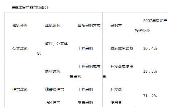 根据产品的流通渠道,建筑陶瓷砖产品的销售市场可分为工程市场和零售市场两大类别。工程市场主要集中于城市基础设施工程建设引起的政府采购以及各地房地产商对建陶产品的集中采购零售市场主要集中于终端经销商、代理商对终端客户的销售。