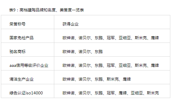 在市场竞争中,部分高档建陶生产企业逐步得到市场的认可,其中诺贝尔、东鹏、欧神诺等三品牌都拥有建陶行业最重要的六项荣誉,如下表所示:
