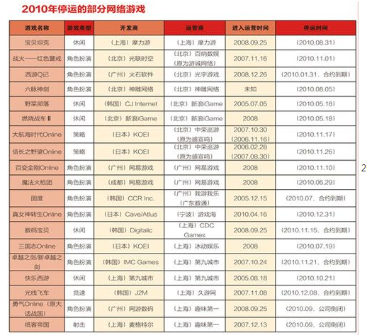 此外,2010年还有86款游戏停止运行或不再进行任何更新和维护。下面列出的仅是其中部分查到确切停运时间的网络游戏