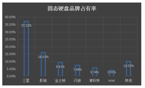 中国的固态硬盘市场上,三星以近四成的市场关注比例独占鳌头,影驰稳坐第二,其市场关注比例为16.03%,其他品牌的市场关注比例都在10%以下。其中,金士顿、闪迪和浦科特分别以9.41%、7.49%和5.74%的市场关注比例排名第三位到第五位;十大热门品牌还包括Intel、OCZ、威刚、金胜维以及东芝。