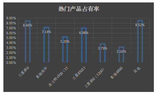 中国的固态硬盘市场上,十大热门产品的竞争十分激烈,各产品之间的关注度差距也很小。其中,三星 850EVO系列(250GB)以8.46%的市场关注比例成为最受欢迎产品;影驰 铁甲战将系列(240GB)和三星 850EVO系列(1TB)分别以7.14%和6.98%的市场关注比例排名第二位和第三位;其他热门产品的市场关注比例都在1.79%-5.20%之间。整体上看,前十热门产品分别来自三星、影驰、金士顿和浦科特四个厂商,其中,三星上榜的产品数量最多,共六款。