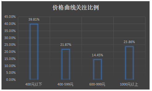在价格方面,2016年2月中国的固态硬盘市场上,价格为400元以下的产品最受用户青睐,其市场关注比例为39.81%;其次是价格在1000元以上的产品,市场关注比例为23.86%;价格为400元-599元和600元-999元的产品市场关注比例分别为21.87%和14.45%。