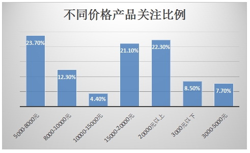 中国4K电视市场上,价格段的关注重心相对偏高,这也是受到超高清电视的高价位段所影响。具体来看,本月5001-8000元以23.7%的关注比例成为最受消费者关注的价格段。20000元以上价格段紧随其后,关注占比为22.3%,高于其他细分市场。排在第三位的是15001-20000元价格段,关注占比为21.1%,较上月有明显上涨。