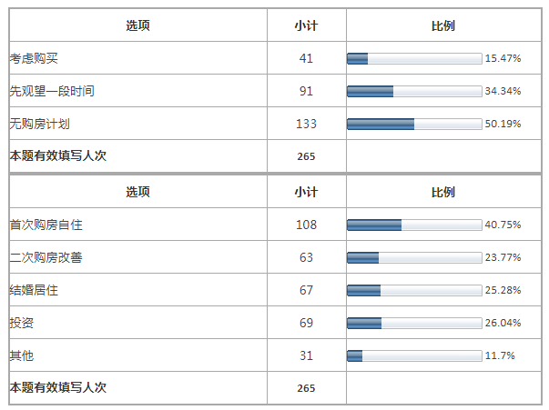 被调查者中半数人无购房计划,三分之一左右的人表示先观望一段时间,只有少数部分人群考虑购房。大部分人购房的目的是首次购房自己居住,其余为二次购房改善、结婚居住、投资等目的。