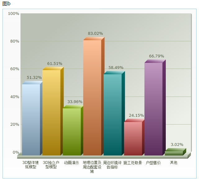 1.能接受通过互联网或手机APP软件看房选房的群体占很大的部分,如图a中的1表示特别能接受,5表示特别不能接受。对于互联网看房时人们最关心的内容是房产的地理位置及周边配套设施,其次是户型的价格。如图b所示。