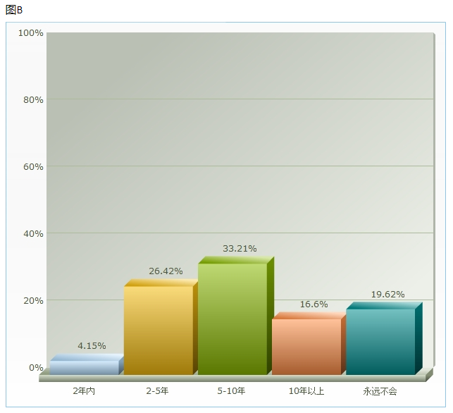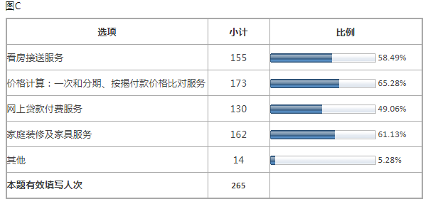 有百分之52.83%被调查者认为互联网看房选房模式可能会取代传统看房选房模式,图A。并且有三分之一的人认为互联网房产模式需要5-10年才能取代传统房产模式,图B。对于互联网房产营销模式的发展下会衍生出的服务看法不一,其中最希望的服务室①价格计算:一次和分期、按揭付款价格比对服务②网上贷款付费服务,如图C。