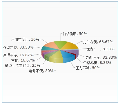 认为其洗车方便的占总比例的8.33%,价格低廉和占用空间小的都是占总比例的50%,移动方便的占总比例的33.33%,清理干净的占总比例的16.67%,还有一些其他的优点也是占总比例的16.67%。