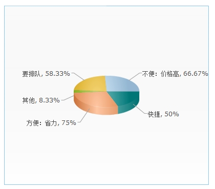 对于洗车的不便之处调查中,66.67%的人认为其价格高,58.33%的人认为需要排队,还有一些其他不便之处的占总比例的8.33%。认为其方便之处:75%的人认为其比较省力,50%的人认为比较快捷。