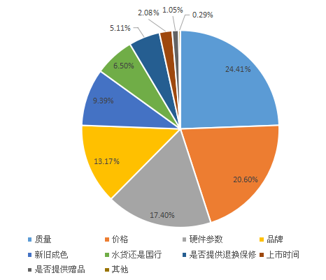 在大多手机用户的思维里,二手手机大多存在因使用年限问题出现大大小小的故障,因此,质量是用户最关注的问题,比例达24.41%,甚至超过了价格因素,价格因素比例略低于质量,为20.6%,硬件参数、品牌和新旧成色也是用户同样关注的因素,比例分别为17.4%、13.17%和9.39%,水货还是行货、退还保修和上市时间并不是用户特别关心的因素,对于赠品的提供仅有1.05%的用户关注。