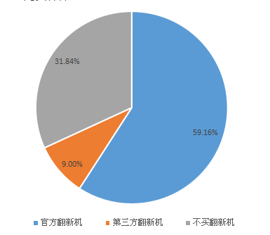 近七成的用户还是会选择购买翻新机,但由于质量因素在用户心理的地位,59.16%的用户更愿意买官方翻新机,9%的用户愿意购买第三方翻新机,仍有31.84%的用户表示不会买翻新机。