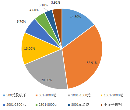 大部分用户对二手手机的价格预期不高,八成以上的用户对二手手机的心理价位在2000元以内,其中500元以下的比例为14.8%,501-1000元时用户认可最高的价位,比例高达32.91%,1001-1500元之间的比例为20.9%,1501-2000元的比例为13%,当二手手机的价格超过2000元的时候,人们的购买欲望直线下降,比例不足两成。