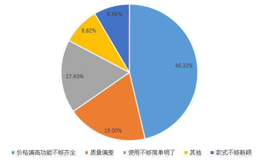 近五成的用户认为市场上的吸尘器价格偏高功能也不够齐全,比例高达46.32%,可见消费者对于商品在功能上的要求是最高的,质量在用户关注上屈居第二,19%的用户表示市场上的吸尘器质量偏差,17.4%的用户认为使用不够简单明了,8.46%的用户认为款式不够新颖。