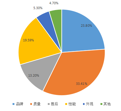 质量和品牌永远是用户最关注的重要因素,比例分别为33.41%和23.8%,品牌在一定程度上代表了商品在用户心中的口碑,19.59%的用户主要考虑性能因素,每个商品在使用一段时间后存在或多或少的问题,售后给用户在使用上有相当的保障,13.2%的用户购买时考虑的主要因素是售后,外观在用户购买时考虑的因素较低,仅有5.3%的用户会去考虑。