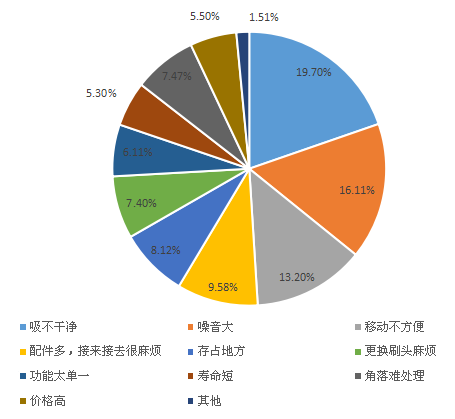 对于吸尘器目前存在的最大问题,是吸不干净和噪音大的问题,比例分别为19.7%和16.11%,13.2%的用户认为移动不方便,这三点是用户认为现存吸尘器最大的三个问题,对于配件多,接来接去很麻烦、存在地方、更换刷头麻烦、功能太单一、寿命短、角落难处理和价格高等,比例都较为平均,可见大多数用户是接受这些零碎的问题的。