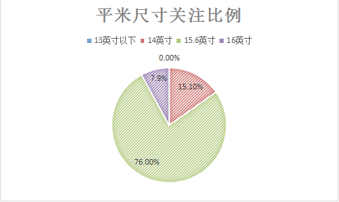 从产品屏幕尺寸的角度来看,影音娱乐本市场主要以大屏产品为主,13.3英寸及以下产品基本没有话语权,关注度仅为1.0%。15.6%英寸产品占据绝对优势,消费真关注度为76.0%。14英寸虽然以15.1%的的关注度排在第二位,但上升空间十分有限。