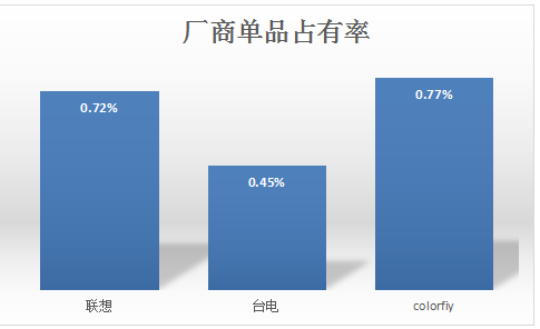 本月三大厂商在售产品数量分别为32款,46款和20款,台电占据产品数量优势。市场平均竞争力方面,联想与Colorfly单品关注率相对较高,分别为0.72%和0.77%,差距仅为0.05%。与之相比,台电由于关注度较为分散现象严重,单品关注率仅为0.45%。