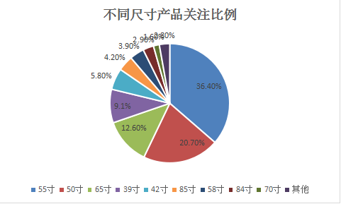 2014年1月,中国超高清电视市场的平均屏幕尺寸高达58.38英寸,较上月上涨了0.44英寸,高于其他电视市场水平。具体来看,本月55英寸依旧是最受消费者关注的电视屏幕尺寸,关注比例超过1/3,达36.4%,较上月上涨了8.0%,排在第二位与第三位的分别是50英寸和65英寸,关注比例分别为20.7%和12.6%。