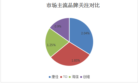 从关注占比的变化来看,本月TCL、创维、三星和索尼均有所下滑,其中,TCL的降幅相对最大,达3.3%,也因此以0.1%的差距退居第二位。