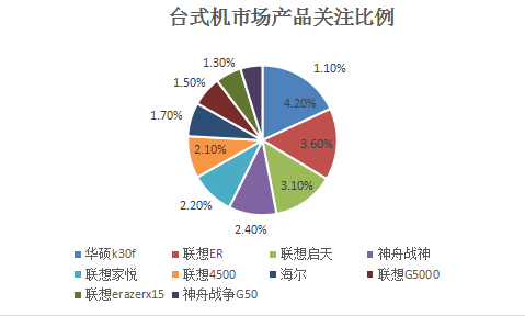 10月台式电脑市场上,华硕 K30BF-A8614M1连续三个月领跑产品榜,本月用户关注度为4.2%。联想Erazer X310和启天 B4550分列第二、三位,两款产品关注比例为3.6%和3.1%,竞争较为激烈。神舟 战神 G60-I7 D2等七款产品处于第三阶梯,用户关注度集中于1.0%-2.5%之间,其它产品用户关注度相对较低。