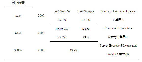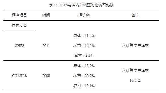 表2列出了与国内外调查数据拒访率的比较。就国内调查而言,CHFS比CHARLS分别低3.75%、5.22%和6.19%。需要注意的是,2008年的调查只涉及甘肃和浙江两个省份,而2011年CHFS调查涵盖25个省份,两者的拒访率进行直接比较可能存在偏差。三个国外数据库都具有一定的可比性,其调查内容都在不同程度上涉及到家庭的资产、收入和支出等,尤其是SCF,是直接可比的调查项目。从表2可以看出,三个调查的拒访率都在25%以上。。这表明拒访率与国外同类调查相比,处在很低的水平上。