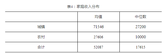 数据显示,家庭收入均值为52087元/年,其中,城镇庭和农村家庭分别为71546元/年和27606元/年。