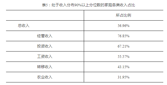 根据CHFS调查数据,中国家庭收入不均现象非常严重。处于收入分布90%以上分位数的家庭的可支配收入占所有家庭可支配收入的56.96%。表5汇报了这些高收入家庭各项收入在所有家庭中的占比情况,其中,经营收入的76.85%被处于收入分布90%以上分位数的家庭所有,经营收入不均现象最为严重。