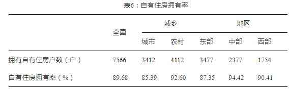 在调查样本中,自有住房拥有率为89.68%。城市家庭自有住房拥有率为85.39%,农村家庭拥有自有住房率为92.60%。东、中、西部地区家庭自有住房拥有率分别为87.35%、94.42%、90.41%。世界平均住房拥有率为63%,美国为65%,而日本为60%,我国自有住房拥有率处于世界前列。