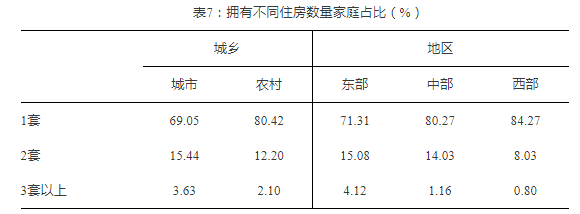 城市户均拥有住房已经超过了1套,为1.22套,农村户均拥有住房为1.15套。拥有一套住房的城市家庭占69.05%,拥有两套住房的城市家庭占15.44%,拥有三套及以上住房的城市家庭为3.63%。而在农村, 80.42% 的家庭拥有一套住房,12.20%的家庭拥有两套住房,2.10%的家庭拥有三套住房。从不同地区来看,东部地区71.31%的家庭有一套住房,15.08%的家庭有两套住房,4.12%的家庭有三套以上住房。中部地区80.27%的家庭有一套住房,14.03%的家庭有两套住房,1.16%的家庭有三套以上住房。西部地区84.27%的家庭有一套住房,8.03%的家庭有两套住房,只有0.80%的家庭有三套以上住房。