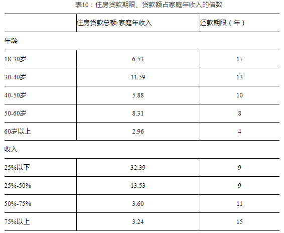 表10表明住房贷款总额远远大于家庭年收入,户主年龄在30-40岁之间的家庭负担最重,贷款总额平均为家庭年收入的11倍多;收入处于最低25%的那部分家庭贷款额达到了其年收入的32倍之多。由此可见,住房贷款是许多家庭的沉重负担,“房奴”在中国的确是一个值得关注的现象。