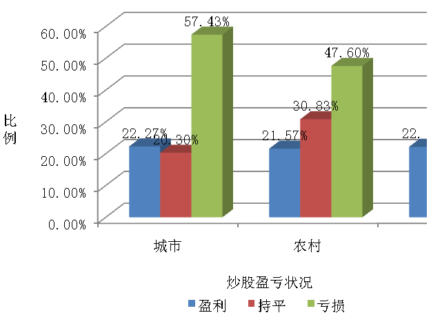 有效样本中,盈利的家庭占22.27%;盈亏平衡的家庭占21.82%;亏损的家庭比例达56.01%。可见,高达77%的炒股家庭没有从股市赚钱。这与人们上说的“二八”法则比较接近。